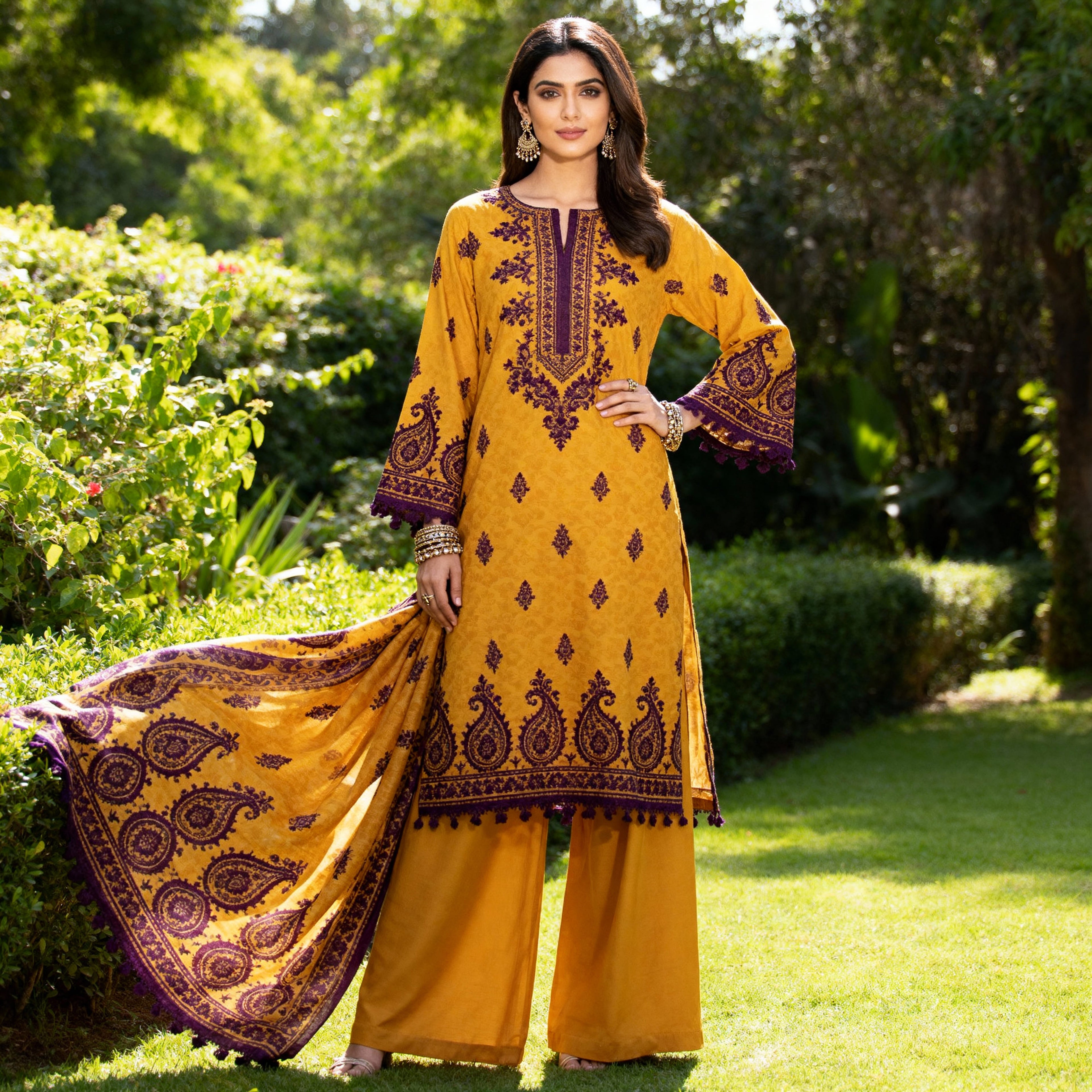 Amber Glow – Mustard Yellow & Purple Printed Lawn 3 Piece Stitched Suit